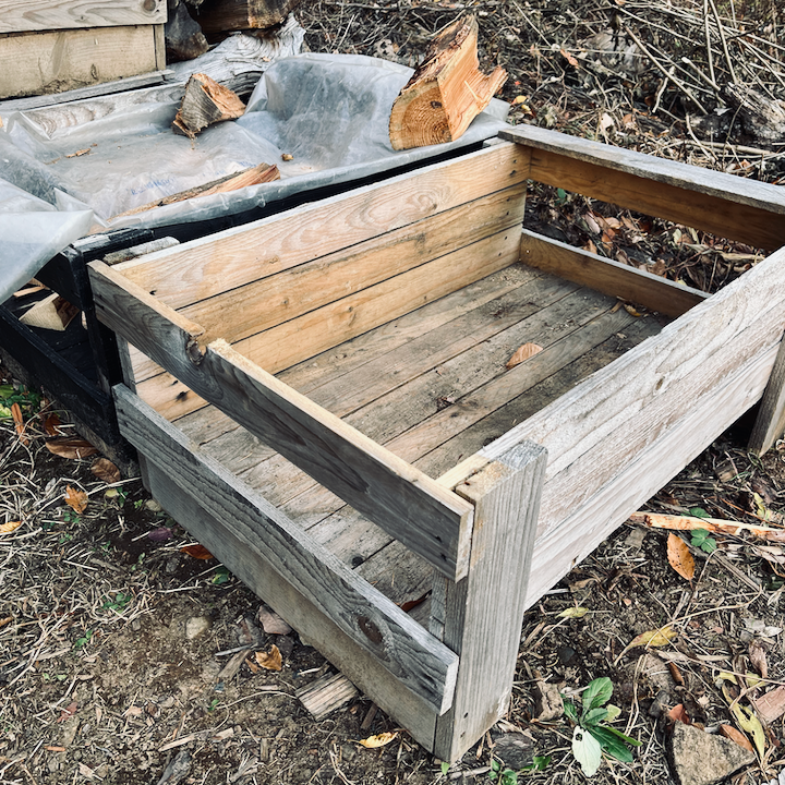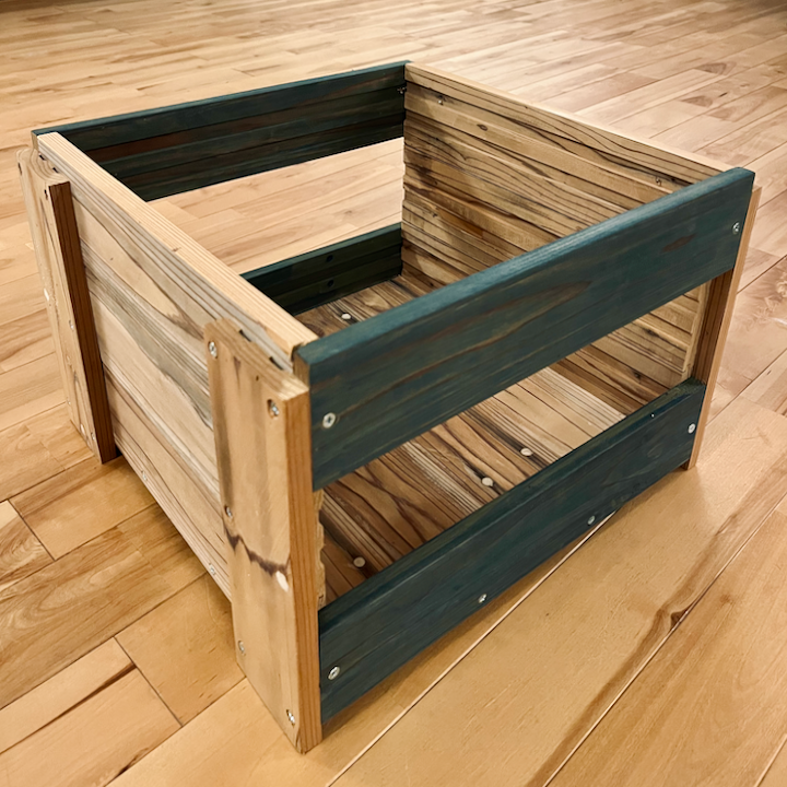 何ということもない木製の手作りコンテナ。しかし、持ち手の解決とスタッキングのヒントを得る。