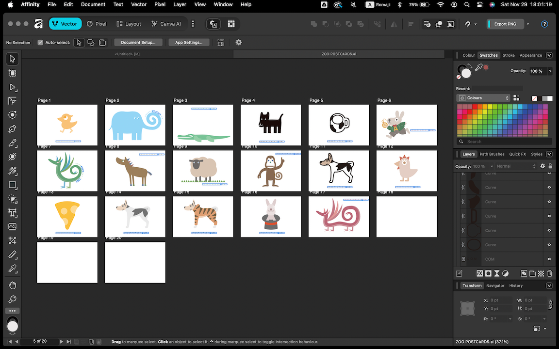1989 年から使用している Adobe Illustrator(英語版 Illustrator 88 の頃)だけど、自分の使用目的に対して恐ろしく高機能に進化し、とても使い切れない(そして使わないだろう)機能に辟易もしていた。タイミング良く Affinity 無料化のニュースを読んでインストールしてみる。噂に違わない高機能さは無料版にとてもそぐわない、初めてベクターアプリケーションを使用する人には十分すぎる完成度だろうなと思う。しかし自分が完全に乗り換えるかというと微妙なところ。必要な初歩的機能が見つからなかったり(探せばあるのかもしれない、いやあるのだろう)、ほとんどの操作にてまどったり、Illustrator に馴染んだ指先にはストレスが多かった。絶対に乗り換えられないかというと、全然そんなことはないです。素晴らしいソフトウエアだと思います。自分では滅多に使うことのない画像編集ソフト、ページレイアウトソフトとしては固定観念の無いぶん逆に馴染むことができるような気がします。とりあえず無料化の英断はとてもありがたいです。