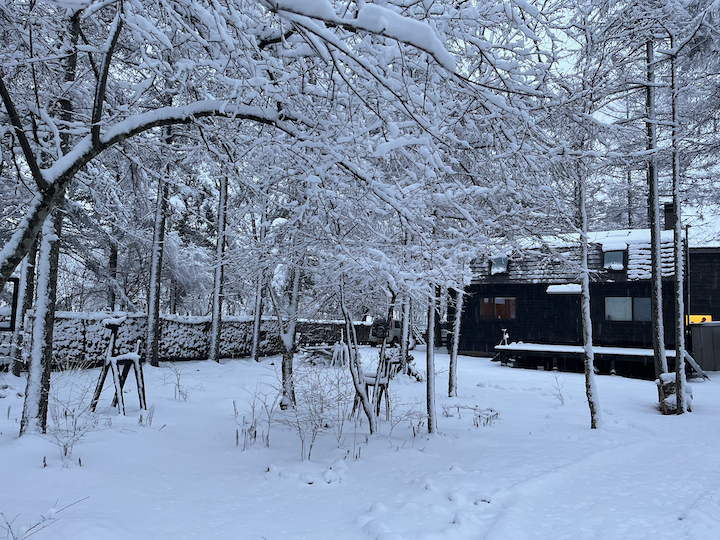 茅野の「無印良品」に寄ってから蓼科 M さん邸へ。お貸ししていた屋外用時計型薪ストーブの回収と、