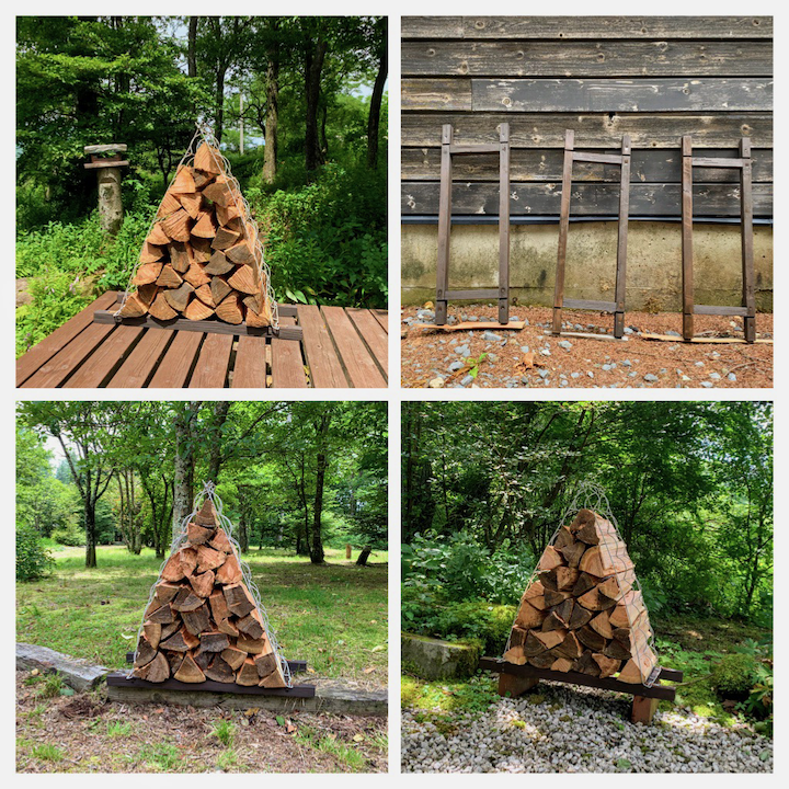設置場所を均して、草むしりして、土壌処理型の除草剤を撒いて、水糸と水平器を使いながら補修済みの三角薪ラック(大)を設置。