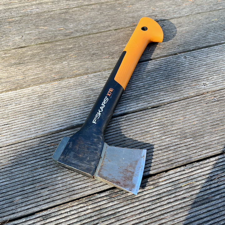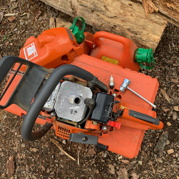 工事が始まるまで週末ごとに通って、伐採、枝打ち、草むしりなどの作業にかかりました。スコップ、ノコギリ、チェンソー、薪割り斧などの道具類とともに屋外用小型薪ストーブを購入し、現地に設置した組み立て式の物置に保管します。