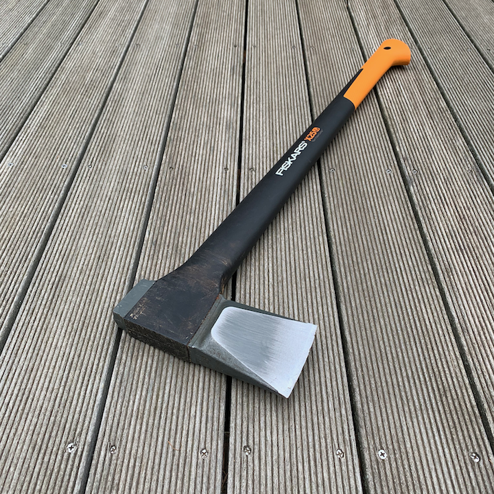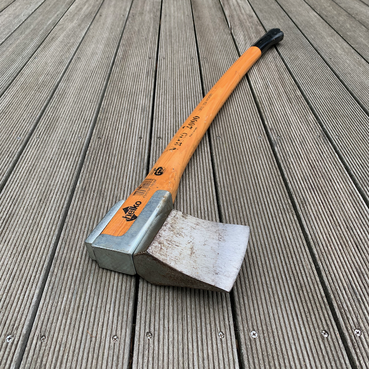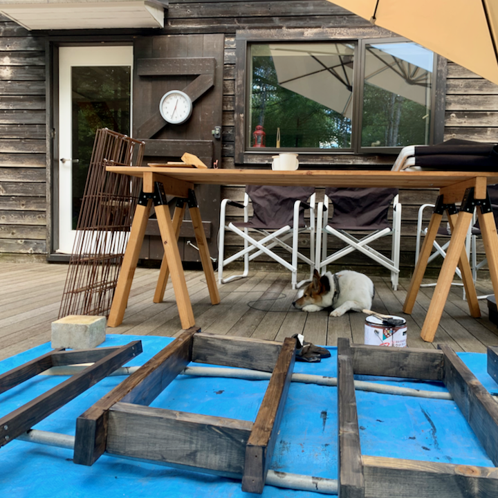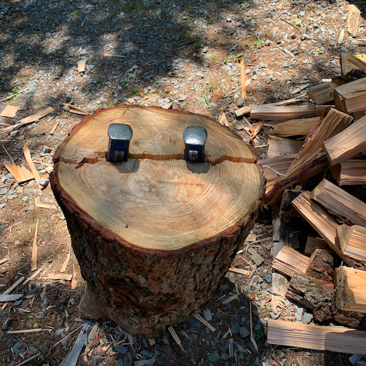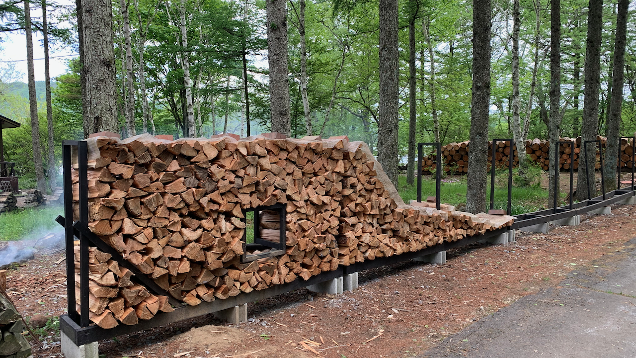 細めの丸太 1 本分を割って終了、4 つの三角薪ラックが 2 つの台形薪ラックになりました。思ったよりもボリューム感が出て、存在感があります。