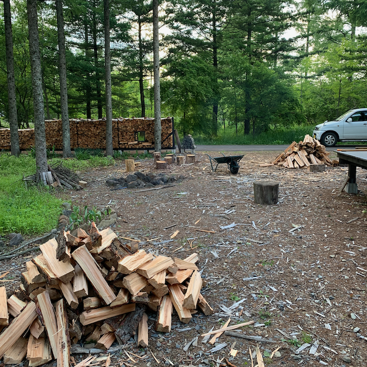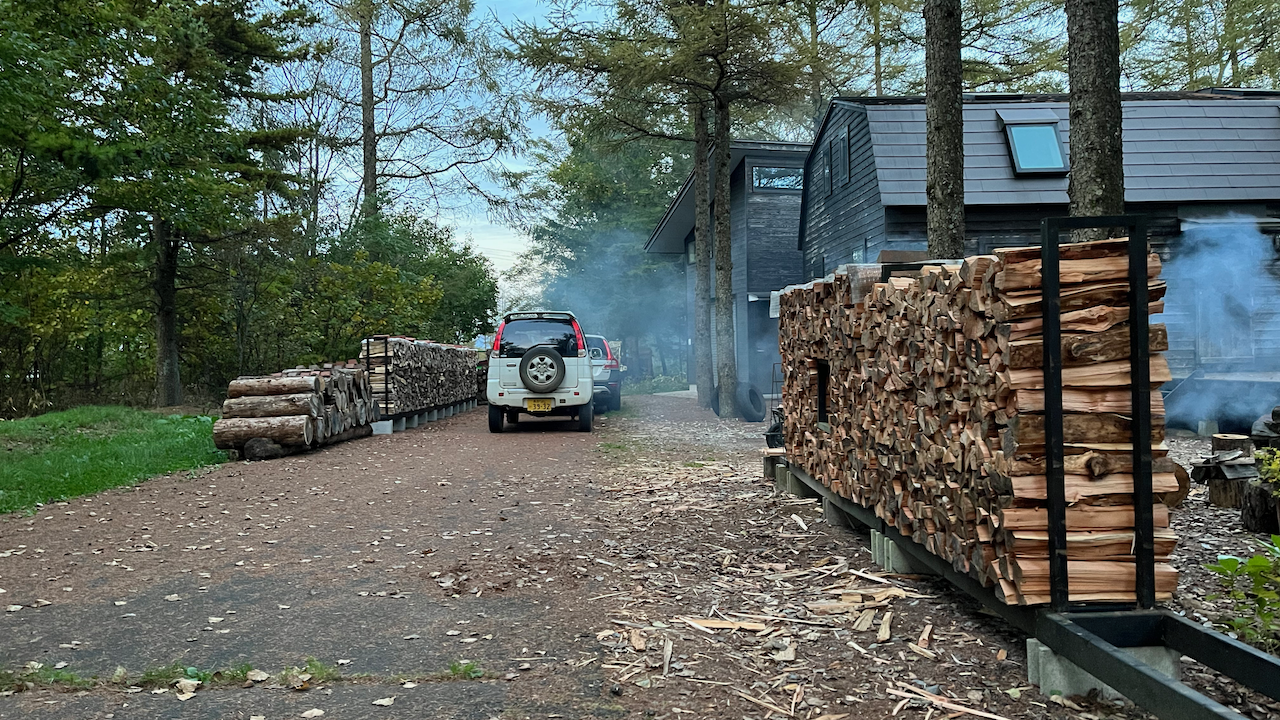 雪が降る前に下草の処理と枝打ちなどが終わり、建物と庭の形がはっきりと見えてきました。後はひたすら薪割りをして、来々シーズンに備えます。