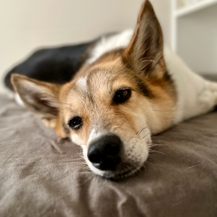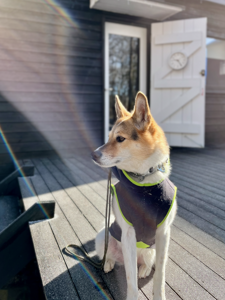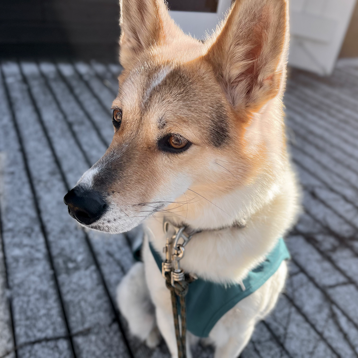 SUZUKOUBOU さんからいただいたスナップベスト、お腹もしっかり守ってくれる構造なのに、評判通りの着せやすさです。着心地も良さそうで、楽しい散歩になりました。シンプルなデザインも良い感じです。