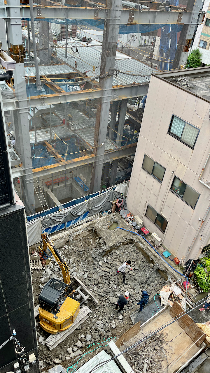 横山町で現地確認。狭っ。工事現場の片隅の、本当に隙間ですが大切な場所。例によって、ロープを張った敷地は想像以上に狭く感じます。壁が立ち上がって中に入ってみると、これが意外に広いな、に変わるのが不思議です。