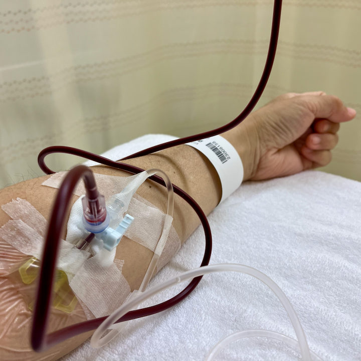 朝から採血。ヘモグロビンの上昇がそれほどでもないので再び輸血。昨日と同じ量だけれど 2 時間で終わる予定(2 時間半かかった)。