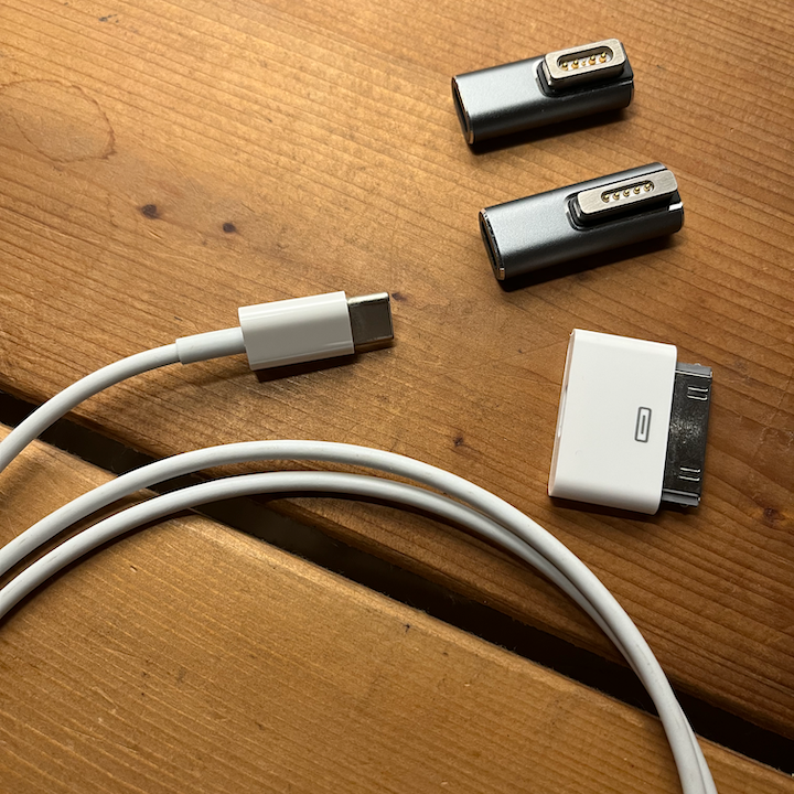 上から自分の 2010 MacBook Pro MagSafe 1、おくさんの 2015 MacBook Pro MagSafe 2、自分の 2011 iPod touch 用の Type-C 変換アダプター。これで自分の 2018 MacBook Pro 用充電器ひとつで対応できるようになりました。古い機種用のケーブル劣化に怯える心配もありません。