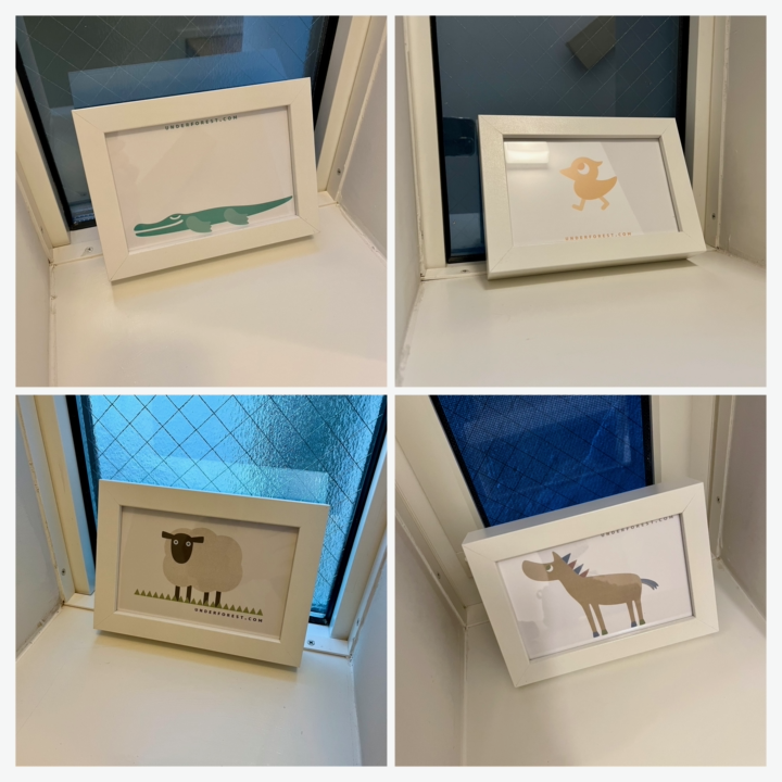 1F から 4F までの階段横にあるスリット窓に、ミニフレームを飾りました。動物の力を借りて好感度を上げる作戦です ;-)